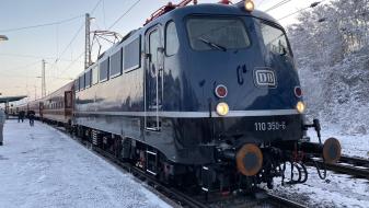 Für die Fahrt kommt eine Elektrolokomotive der Baureihe 112 zum Einsatz mit den drei vereinseigenen Reisezugwagen.